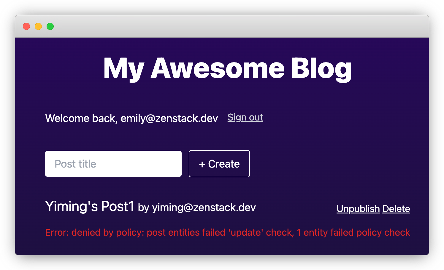 We didn't do any UI blocking to prevent Emily from unpublishing or deleting other people's posts; however, if she tries to do so, the operation will be rejected by the server-side code: